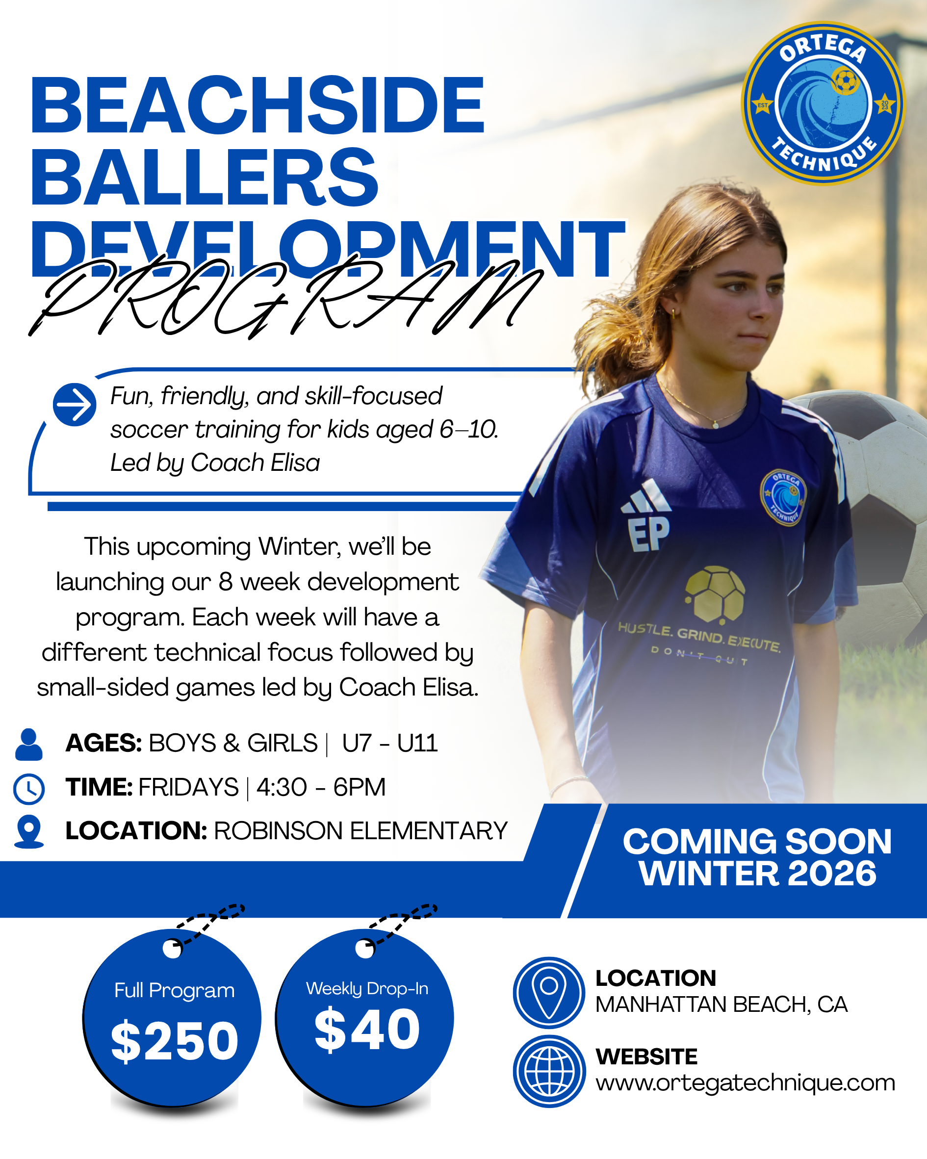 Beachside Ballers is an 8-Week developmental program designed to help young players build a strong technical foundation while learning to love the game in a fun and supportive environment. Creating a space where they can grow with confidence. Perfect for any players who want extra touches on the ball.